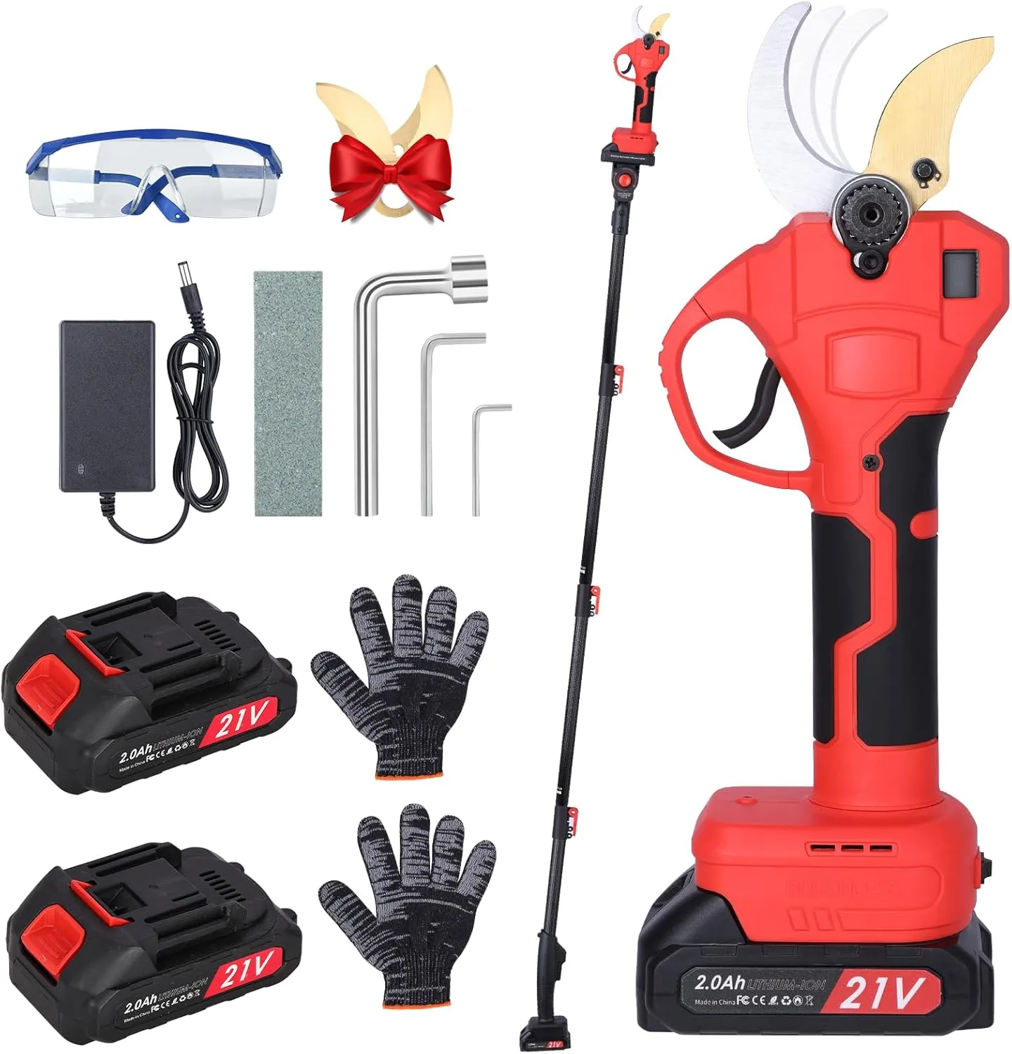 Tijeras de Podar Eléctricas 50MM con Batería y Pantalla LCD - Incluye Poste y 2 Baterías de 21V/2Ah para Jardinería, Olivos y Ramas